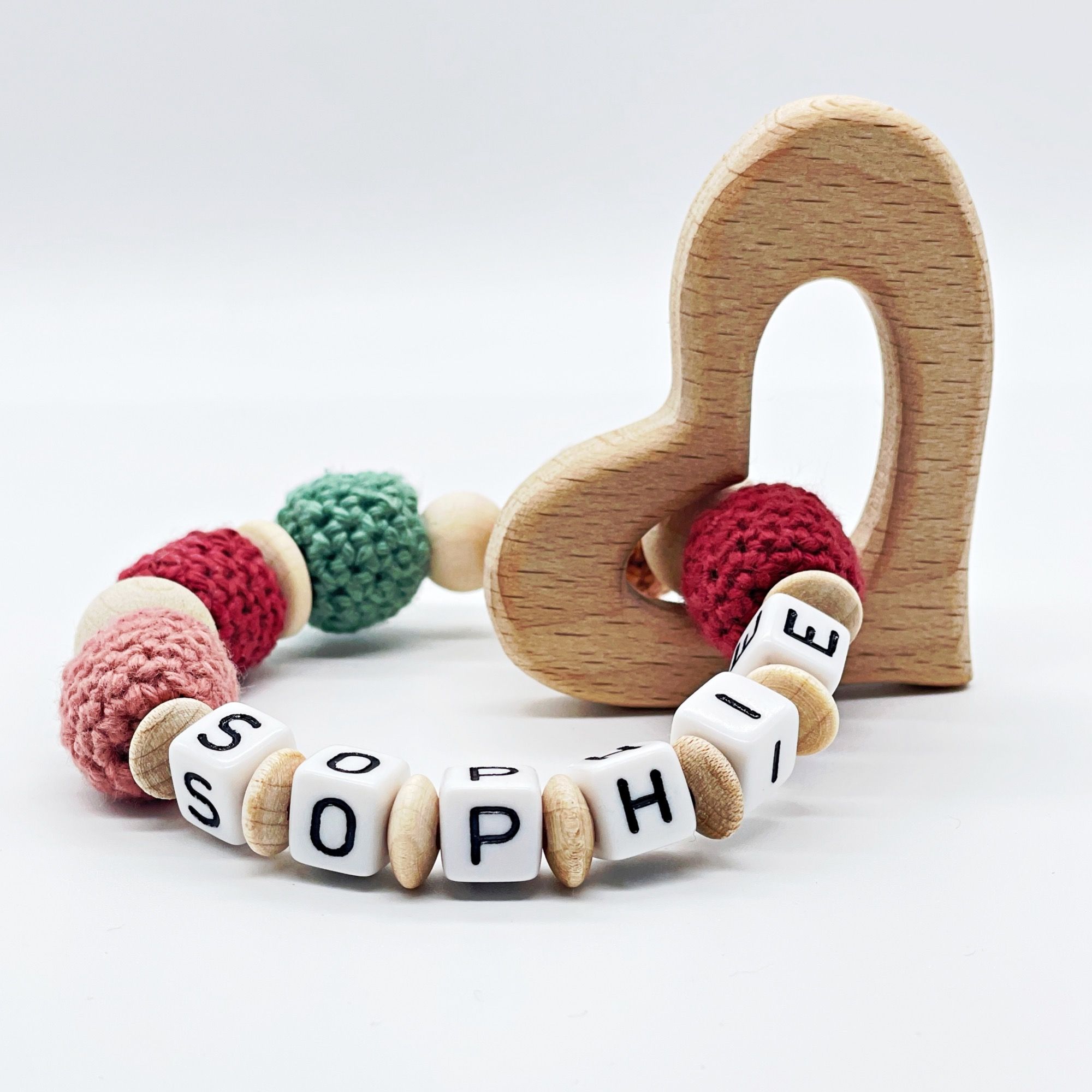 Eine Personalisierung mit Name ist gerne bei Schnullerketten und Greifringe bis max. 6 Buchstaben möglich.